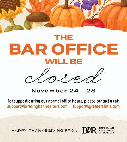 BAR and GALMLS provide home sales data for the Central Alabama market, including Jefferson, Shelby, Talladega, Coosa, St. Clair, Blount, Bibb, Chilton, Calhoun, Clay, Cleburne, and Randolph counties.